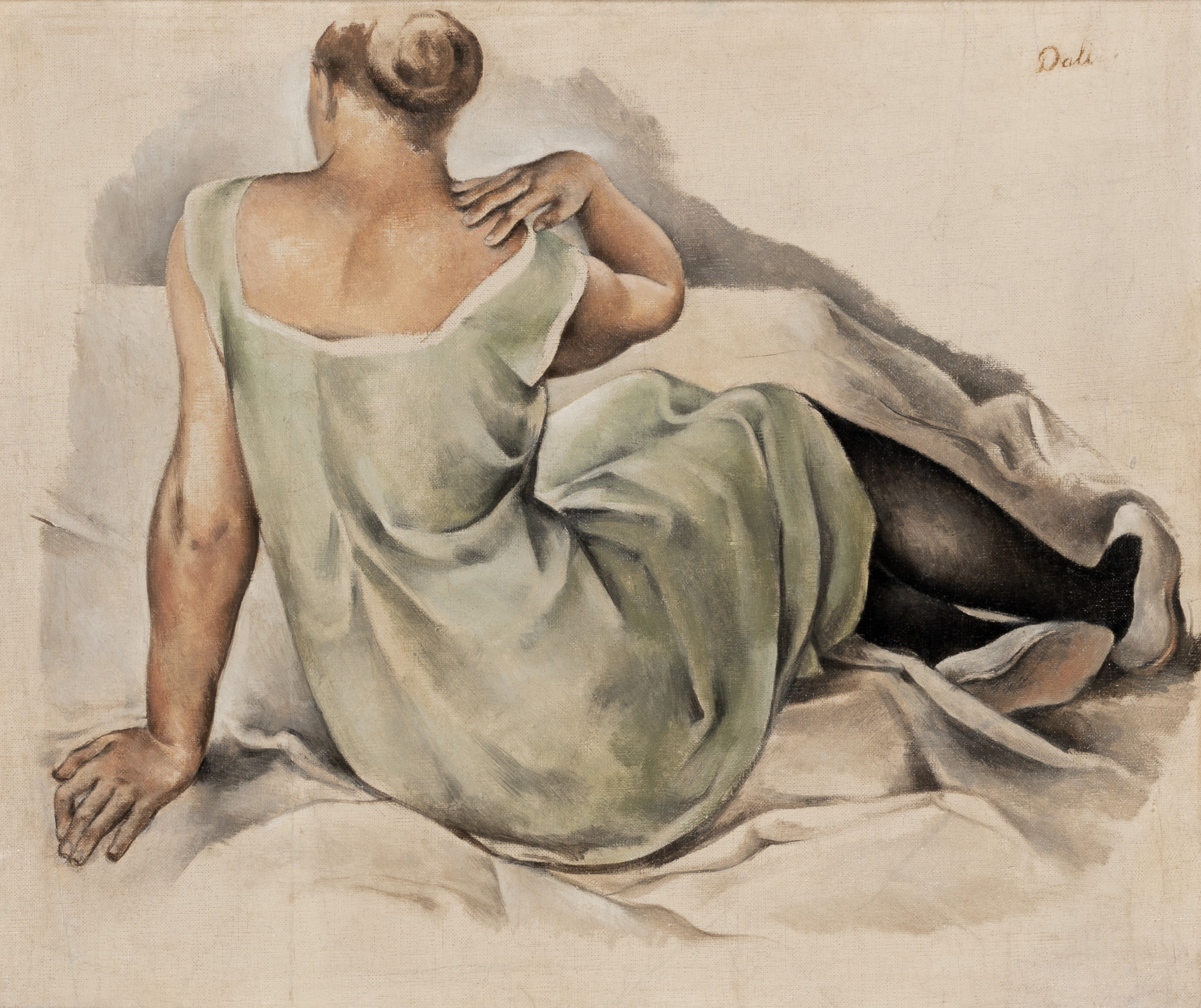 Works from this brief pre-surrealist period reveal a young painter deeply absorbed in the study of form, proportion, and light, refining his technique through close observation of the old masters. The composition, depicting a young woman seen from behind in quiet repose, embodies the serene balance and sculptural fullness that mark Dalí’s finest works from this period. The model's softly turned shoulder, the subtle curve of her back, and the crisp fall of the green dress are rendered with exquisite control, evoking both intimacy and restraint. Stripped of narrative detail, the figure becomes timeless—an exploration of harmony, light, and form that hints at the technical assurance soon to underlie Dalí’s surrealist imagination.